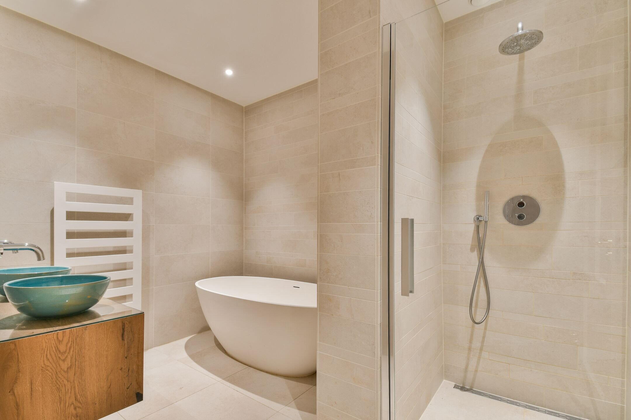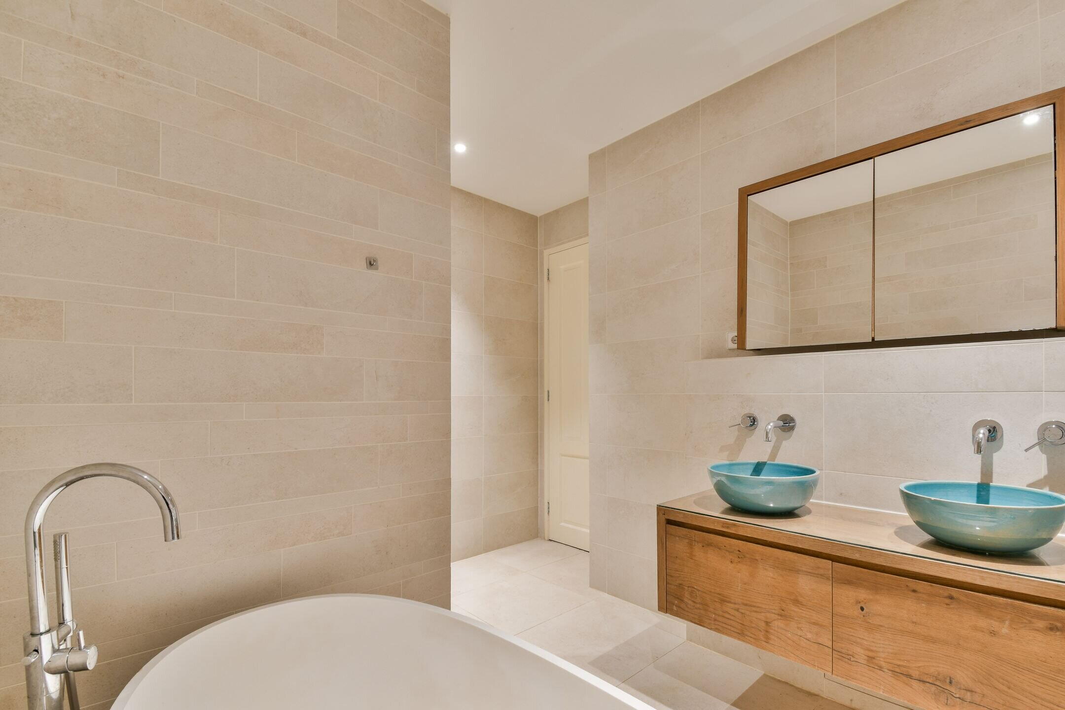 Private entrance, hallway with wardrobe. At the front a spacious bedroom, with the second bedroom located further down the hall. The modern bathroom is fitted with a bathtub, double washbasin, and walk-in shower. There is also a separate toilet with washbasin and a practical storage cupboard with space for a washing machine, dryer, and the central heating system.