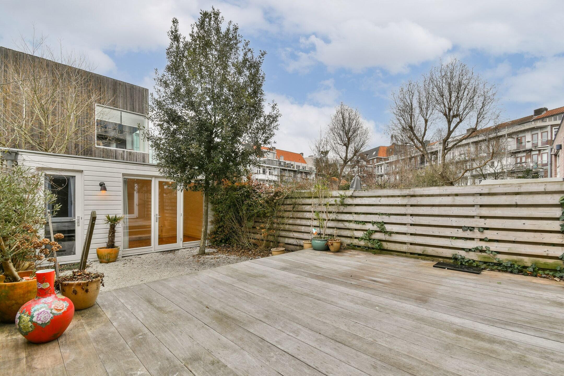 The sunny garden is beautifully designed with a bankirai terrace and, at the back, the modern garden house: perfect as an extra room, studio, or home office.