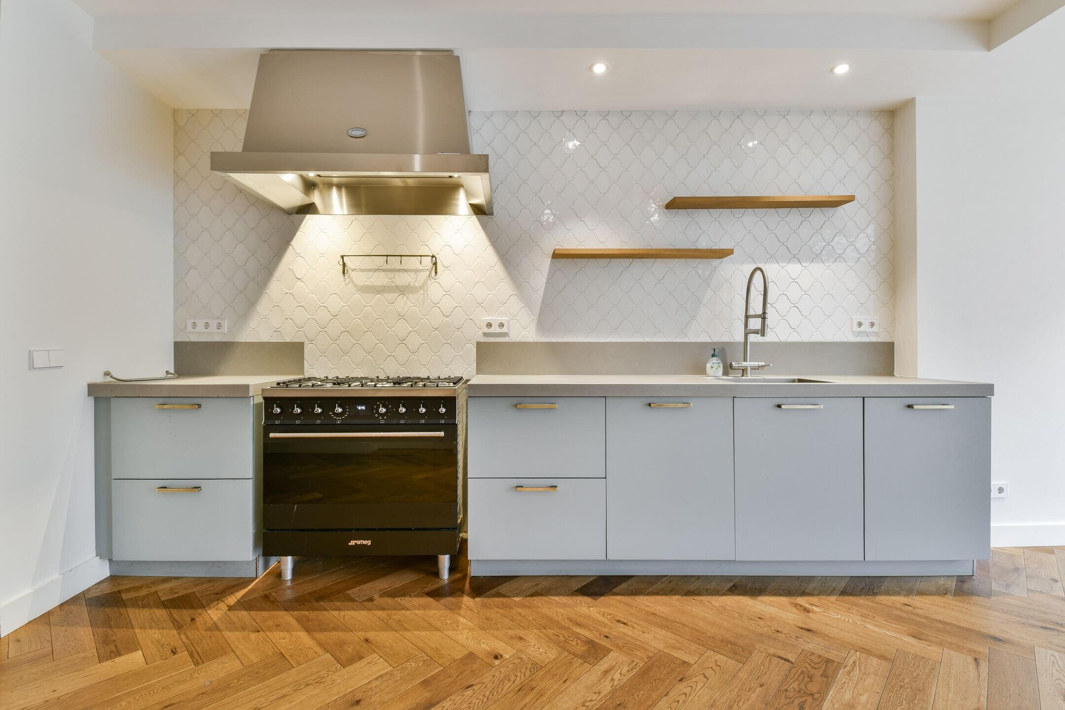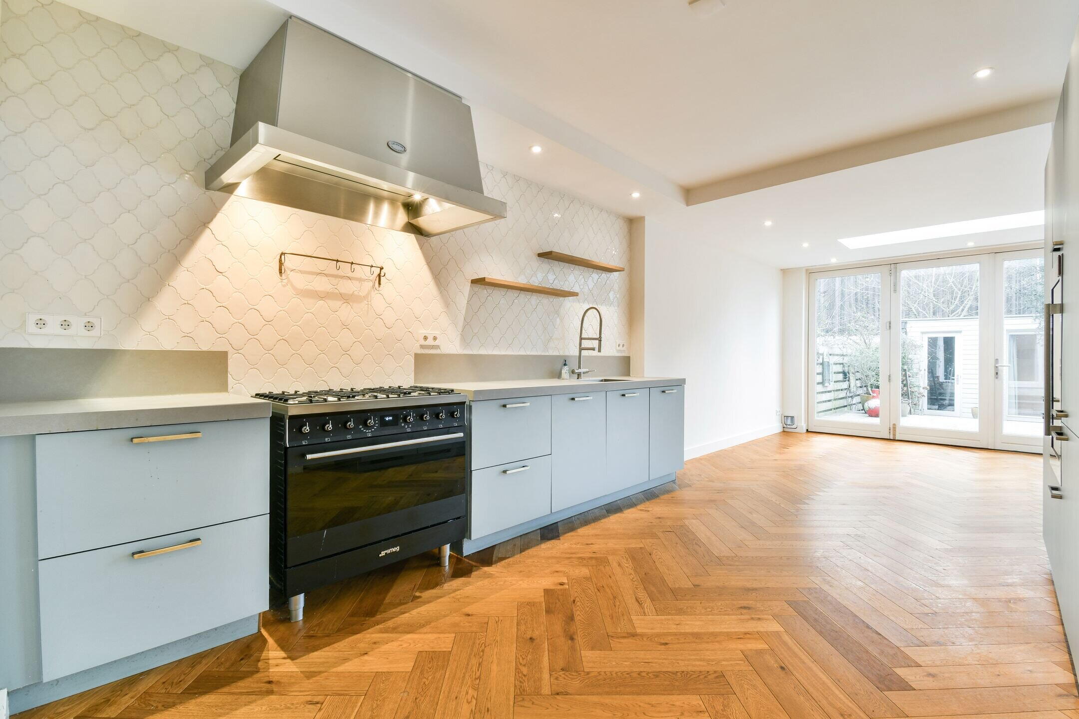 Het hart van de woning is de luxe open keuken met alle denkbare inbouwapparatuur: een 6-pits SMEG fornuis met oven, afzuigkap, vaatwasser, koel-vriescombinatie en zelfs een wijnklimaatkast. De lichte woonkamer met sfeervolle lichtstraat en openslaande deuren naar de tuin maakt het plaatje compleet.